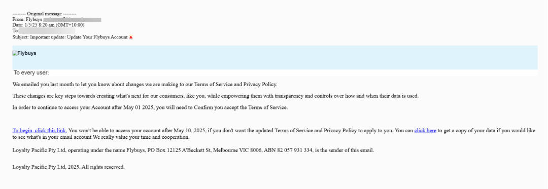 | May 2025 | Example #2 | Important update: Update your Flybuys Account 🚨 |